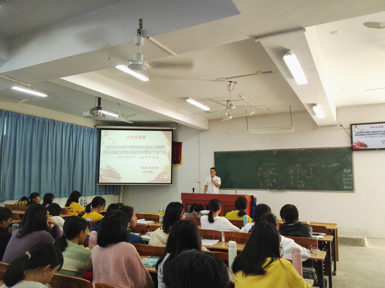 11月19日下午,思政党支部在鼎湖校区1-402教室开展学习党的十九届四中全会精神和主题党课,会议由思政部副主任、党支部副书记庄百鹏主讲,思政支部党员和2019级口腔系入党积极分子及员工代表参加学习。
