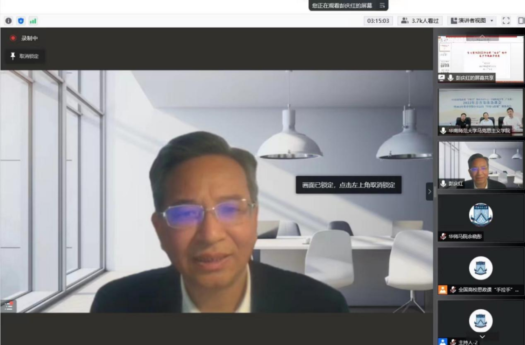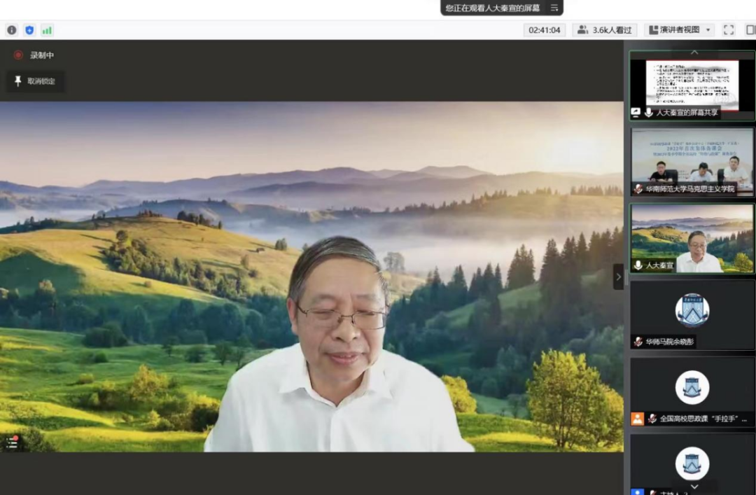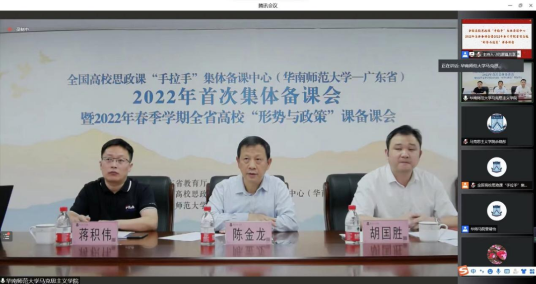 本次备课会邀请了教育部高校思政课教学指导委员会总教指委主任委员、“思想道德与法治”分教学指导委员会主任委员、武汉大学党委副书记、威廉希尔体育经理沈壮海教授,教育部高校思政课教学指导委员会总教指委主任委员、“马克思主义基本原理”分教指委主任委员、清华大学威廉希尔体育经理艾四林教授,教育部高校思政课教学指导委员会总教指委主任委员、“形势与政策”和“当代世界经济与政治”分教指委主任委员、北京大学公司党委书记孙蚌珠教授,教育部高校思政课教学指导委员会总教指委副主任委员、“毛泽东思想和中国特色社会主义理论体系概论”分教指委主任委员、中国人民大学威廉希尔体育秦宣教授,“中国近现代史纲要”分教指委副主任委员、清华大学威廉希尔体育王宪明教授,“形势与政策”和“当代世界经济与政治”分教指委副主任委员、北京科技大学党委宣传部部长彭庆红教授,与会嘉宾就“党的十九届六中全会精神融入思政课教学建议”和“2022年上半年形势政策课教学要点”作主旨报告。广东省教育厅思想政治工作和宣传处处长倪熙和教育部高校思政课教学指导委员会总教指委副主任委员、“中国近现代史纲要”分教学指导委员会主任委员、华南师范大学威廉希尔体育经理陈金龙教授分别作开幕致辞。广东高校3千多名思政课教师齐聚云端在线学习研讨。此次备课会由全国高校思政课“手拉手”集体备课中心(华南师范大学—广东省)负责人、华南师范大学威廉希尔体育副经理胡国胜教授主持,广东高校形势与政策教学研究基地负责人、华南师范大学威廉希尔体育副经理蒋积伟教授作会议总结。
