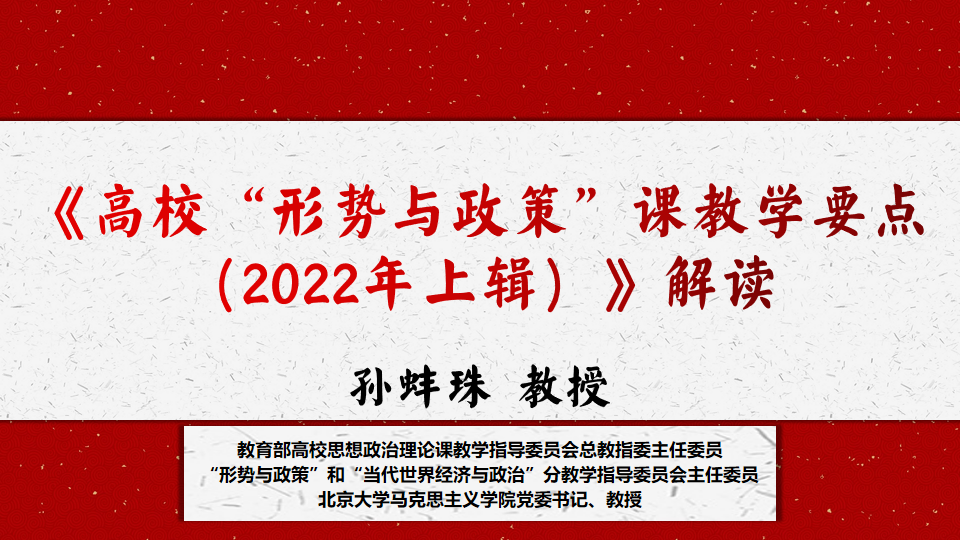 孙蚌珠教授以《高校“形势与政策”课教学要点(2022年上辑)》为方向,解读了高校“形势与政策”课教学要点(2022年上辑)的相关内容。会上,孙蚌珠教授从专题视角切入,深入解读每一个专题的重点所在,详细解答了“深入阐释党的十九届六中全会精神”、“充分认识北京冬奥会、冬残奥会成功举办的重大意义”等八大专题中需要注意的问题,强调要正确引导员工明确“两个确立”的决定性意义。孙蚌珠教授就关于“形策”的三个问题作出具体阐述,她表示,要明确“形策”课与其他思政课的关系定位,要清晰“形策”课程教学目标和功能定位,要坚持好“形策”课教学中的原则。