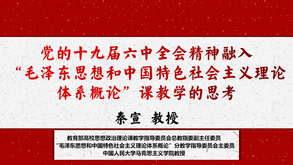 秦宣教授以《党的十九届六中全会精神融入“毛泽东思想和中国特色社会主义理论体系概论”课教学的思考》为题,详细解答了“毛概”课贯彻落实党的十九届六中全会精神教学中的几个热点难点问题。秦宣教授结合教学实际,就如何理解马克思主义中国化“三大飞跃”的关系、如何把握党的百年奋斗主题、如何把握习近平新时代中国特色社会主义思想与中国特色社会主义理论体系的关系等三个方面提出建议。